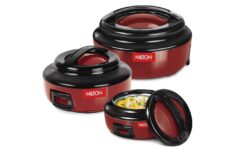 The Milton Ernesto Inner Stainless Steel Jr. Casserole Set of 3 features capacities of 390ml, 750ml, and 1335ml. Designed in attractive red, these casseroles are easy to carry, stackable for convenient storage, and ideal for serving meals at home or on the go.