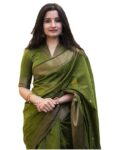 The SIRIL Banarasi Unstitched Saree is crafted for those who prefer custom tailoring. Made from premium fabric, it features classic Banarasi style zari motifs across its body, pallu, and border areas. Being unstitched, you can choose your preferred blouse style and length. Its olive green shade adds a sophisticated and versatile touch, suitable for multiple occasions.